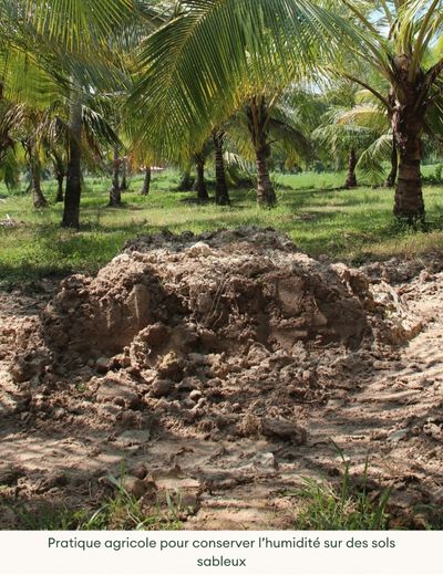 Ayant grandi dans un village en pleine nature, il est essentiel pour M. Nishan Nawarathee d’être en harmonie avec celle-ci. En plus de bénéficier d’un ensoleillement adéquat, le terrain de la plantation, quasi plat, est constitué d’une argile graveleuse peu à modérément profonde. Afin de préserver un maximum d’humidité lors de la plantation de nouveaux cocotiers, Nishan et ses équipes utilisent les coques des noix séchées ainsi. Après extraction de la chair ils les disposent au contact des racines et en surface autour du nouveau cocotier. Cela permet également un apport de nutriment pour le sol, étant un excellent fertilisant naturel. Les feuilles des cocotiers sont également utilisées pour couvrir les sols. Ces facteurs réunis favorisent une bonne culture des noix de coco en facilitant la croissance des racines et la rétention d’humidité.